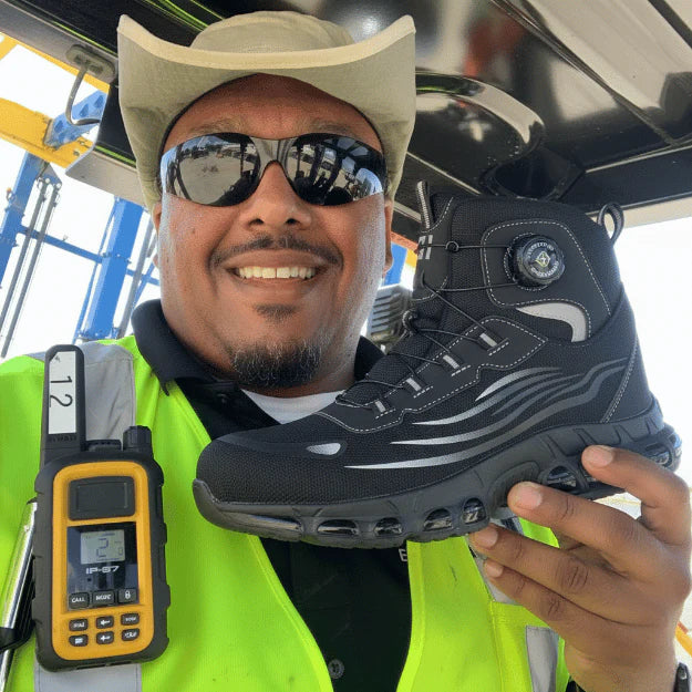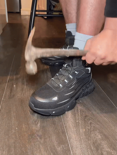 Each pair features a reinforced steel toe cap that absorbs heavy impact and shields your feet from falling tools, sharp edges, and crushing force — without the bulk or stiffness of traditional safety boots.